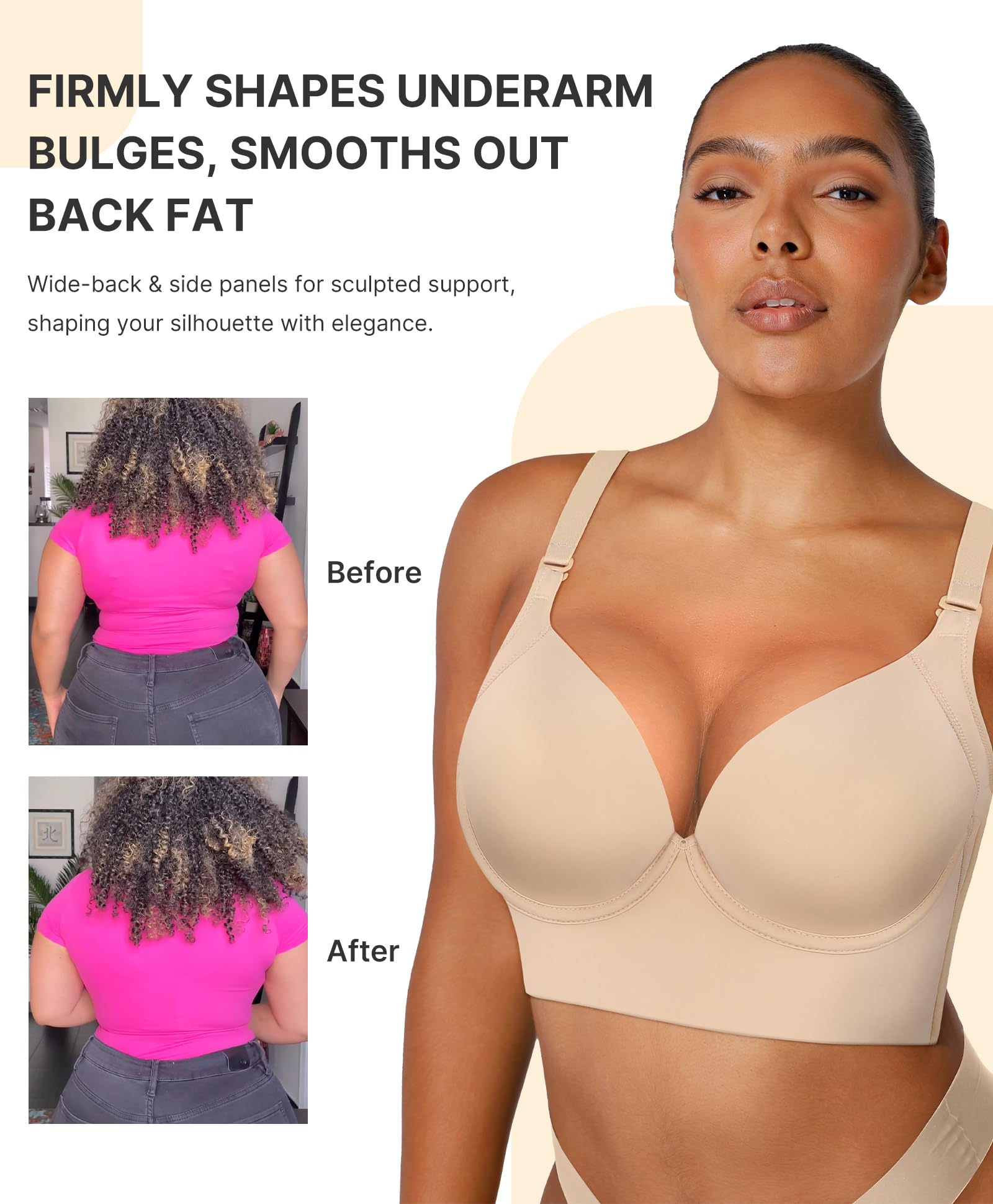 - Omni-Directional Shaping: 3/4 cup shape, highlighting the curve of the breasts; suitable for any body shape, wide side ratio, tighten the side breasts, smoothing the back flab, thickening the quality of the 34 buckle, strong, durable, not easy to be deformed, to prevent the breasts from flaring out, to beautify the breasts, and to flatten the back flab.