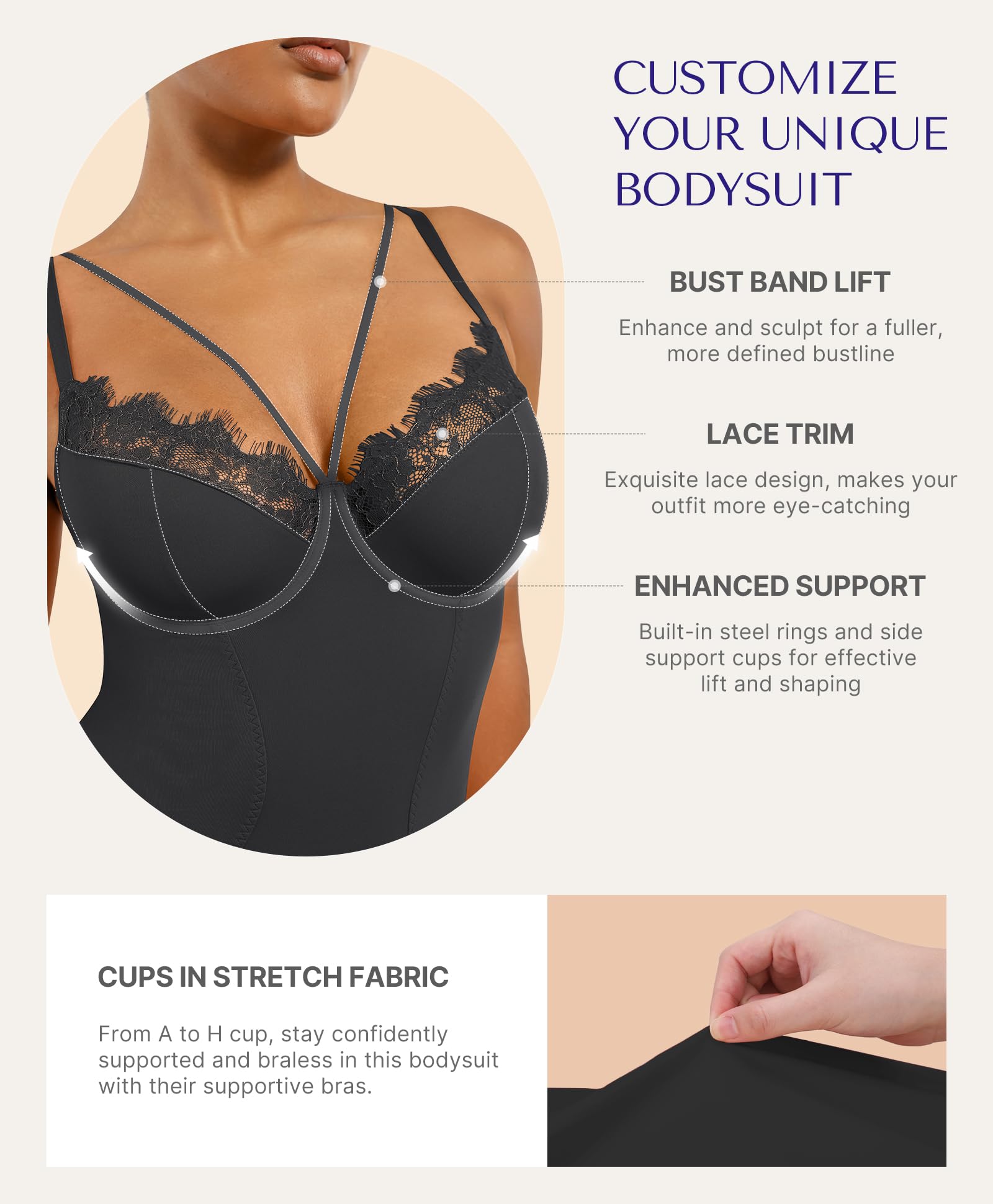 - Chest Lifting and Contouring: This shapewear bodysuit features elastic cups with lace trim to highlight femininity, plus built-in underwire and side support for enhanced chest lifting and shaping. The bust band adds sense of design, creating a fuller, perkier silhouette while maintaining a graceful, captivating look.