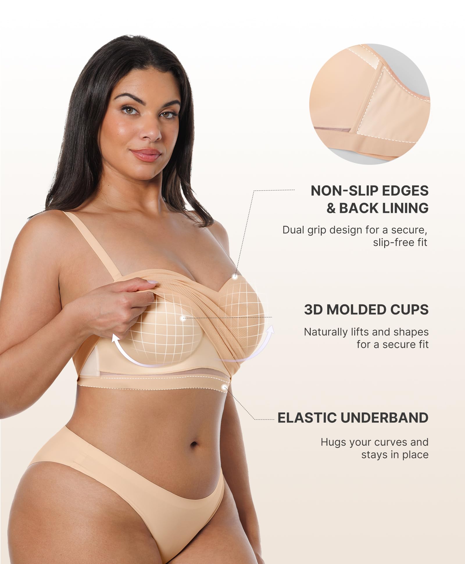 - ăSTAYS IN PLACEă:Featuring integrated, fixed molded cups, this strapless bra offers a smooth, lightweight, and invisible fit. The 3D contoured design gently lifts and shapes your bust for a natural look. With non-slip fabric at the cup edges and anti-slip lining on the front and back bands, it stays securely in place without sliding or shifting.