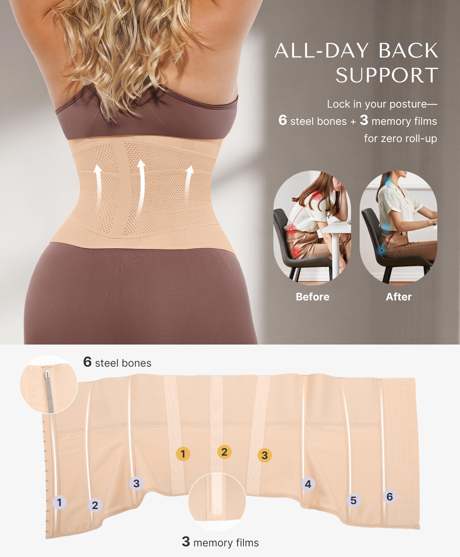 - ăStay-Put Fit, No Rolling, No Riding Upă Tired of waist trainers that shift or curl up the second you sit down? This one stays locked in. The inner waistband is reinforced with 6 flexible memory steel bones and 3 memory films, plus wide elasticâso it stays flat, stays put, and moves with you. Bend, drive, or go about your day without constantly pulling it back into place.