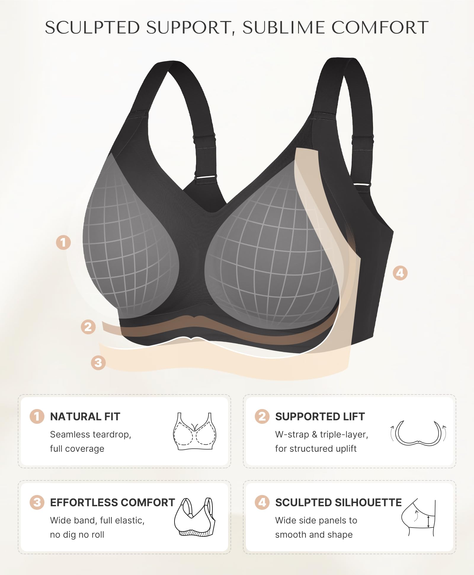 - Smooth & No-Dig Fit: Say goodbye to pressure marks. The 2.5cm adjustable straps relieve shoulder strain, while the widened side panels smooth and secure underarm areas. A 4-row back closure offers customizable support and a sleek silhouette.